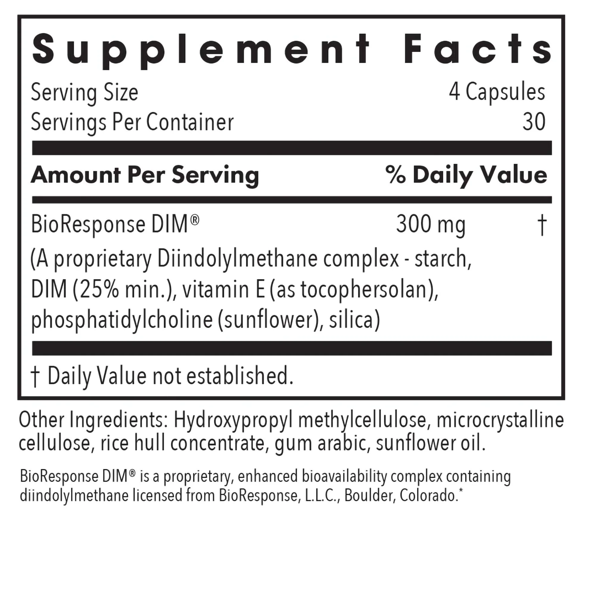 Contains BioResponse DIM, a unique formulation containing pure diindolylmethane, an indole. Indoles are found in cruciferous vegetables such as broccoli, cabbage, cauliflower and Brussels sprouts. BioResponse DIM is a stable, bioavailable form of DIM, made possible through a proprietary delivery system. The formula is co-solubilized with phosphatidylcholine, and microencapsulated in starch particles. Unlike indole-3-carbinole (I3C), patented BioResponse DIM is highly stable and requires no conversion in the stomach.